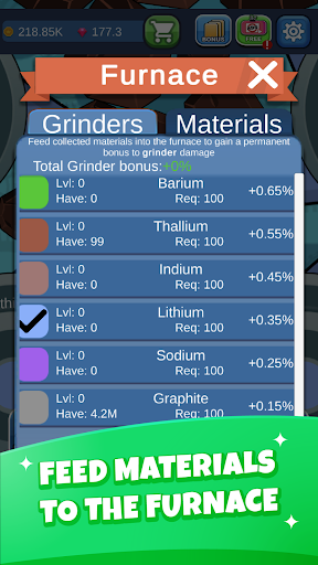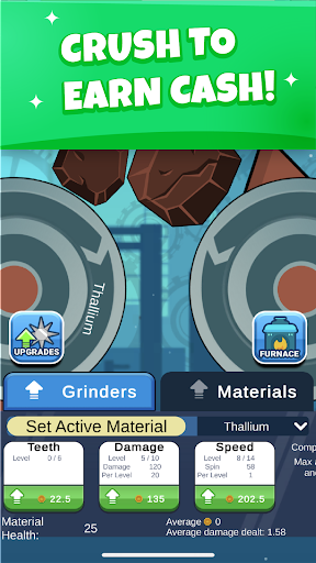 Spend the materials you grind up in the furnace to unlock the power of your grinders. Upgrade your grinders from the softest material all the way to diamond. You'll start weak but grow powerful in this incremental game! Become a crushing simulator tycoon!
