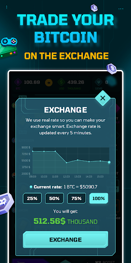 Purchase mining rigs to mine 10 different cryptocurrencies and trade your Bitcoin on the exchange. Exchange prices are updated every 5 minutes to track moves in the market. If Bitcoin soars +1000%, so will your profits!