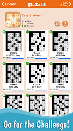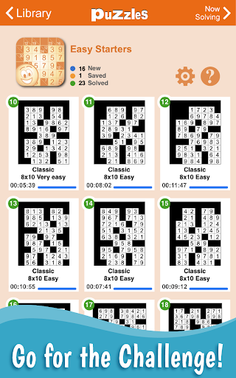 To help see the puzzle progress, graphic previews in the puzzle list show the progress of all puzzles in a volume as they are being solved. A Gallery view option provides these previews in a larger format.