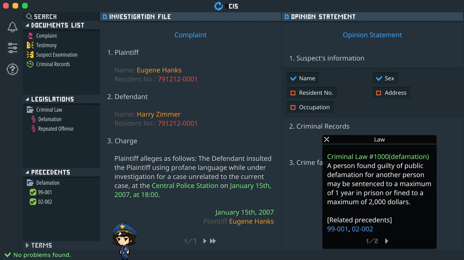 Legal Dungeon lets players organize police documents in cases ranging from petty theft to murder while teaching them about public safety and revealing true criminals. With multiple endings and achievements to unlock, players can weigh the value of human life.