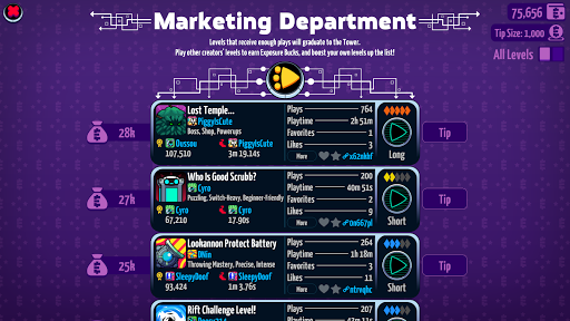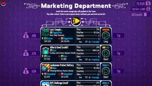 + Gain a following! Share your Level with the entire world and watch as your Play Time, Attempts, and Followers grow. With Levelhead's reliable search and curation features, collecting followers and playing endless user-generated content from around the world has never been easier. You can even use the Marketing Department to promote your Levels to the top of the charts just by playing the game - no need to be famous already to have your Levels played!