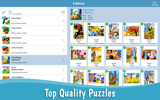 To help see the puzzle progress, graphic previews in the puzzle list show the progress of all puzzles in a volume as they are being solved. A Gallery view option provides these previews in a larger format.