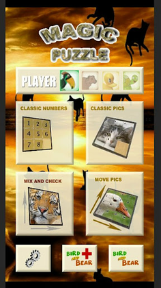"puzzle-15" style, solve number puzzles, solve really challenging puzzles where the whole row or column moves, and the new puzzle where you mix the pieces and fix the correct ones.