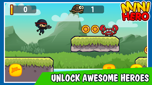 Start with the Mini Hero character which is our game’s creator. Then collect coins to unlock new characters or purchase characters such as the cat, monkey, santa and turtle which have different weapons and capabilities.
