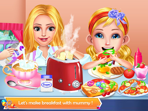 The mother wants to relax, she goes to a mall to buy some clothes and accessories. Use your creativity and compose some wonderful outfits. The next step is so beautiful, choose the perfect makeup for this woman, apply mascara and red lipstick. After this you have to help her to color her hair, choose any color you like, she will be very happy. For the little one, you have to prepare breakfast. This day is so exciting, you can do whatever you like and have fun very well.