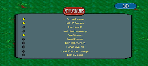 It’s time to put all the drunk wizards and vampire survivors in the dungeons. Use your coins to buy powerups like the ring of power, fireball, thunderstorm, shield, death blade, diamond sword, bonk hammer, wisdom sword, ball bomb, magical particle, and freezing to defeat enemies in one go. Improve your collection status when you kill potent enemies in one swoop. Fulfill achievements like: Buy one powerup, kill 100 enemies, reach level 20, earn 10k coins, etc.