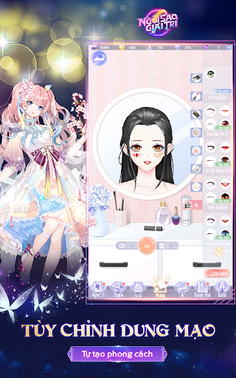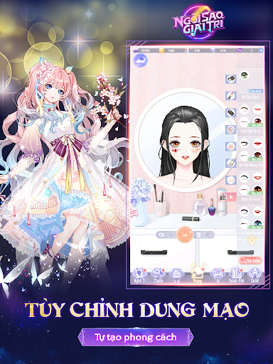 Tính năng độc đáo bậc nhất của Ngôi Sao Giải Trí, chưa từng xuất hiện ở bất kỳ game thời trang cung đấu nào khác! Với tính năng này, bạn có thể tự do lựa chọn cách trang điểm mắt, môi, gương mặt,... Từ đó, tạo ra hàng ngàn lớp trang điểm lấp lánh để phối đồ với từng trang phục trong kho thời trang của mình, sáng tạo trang điểm độc quyền. Bạn chính là mỹ nhân độc đáo nhất trong giới giải trí!