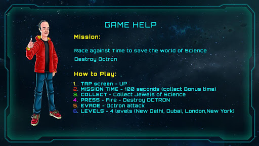 The game includes a 100-second countdown challenge, where players must collect Jewels of Science while avoiding the O Rays of Octrons, who will attempt to stop them. Bonus health and time increases can be earned, but players must watch out for the fire of the Octrons gangs.