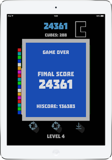 The glass size is 3x3x18. Pentamino 3D blocks drop into 3D glass. You can shift, turn, roll, drop the blocks by touching the mobile screen. All filled layers of the glass are removed. Level is up - speed is up. Try to keep the game as crazy as possible.