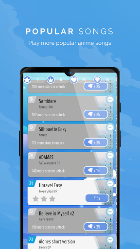Terdapat lagu-lagu dengan tempo lambat yang kami golongkan sebagai permainan mode easy, bagi anda yang masih awam terhadap permainan Piano Tiles Anime ini.