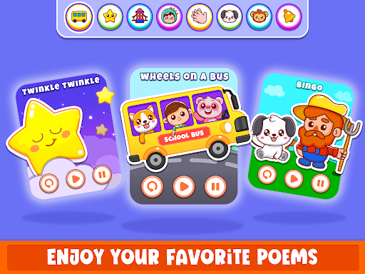 ► Fun lullabies and nursery rhymes like clap your hands, wheels on the bus, and twinkle twinkle to dwell into the rhythm.