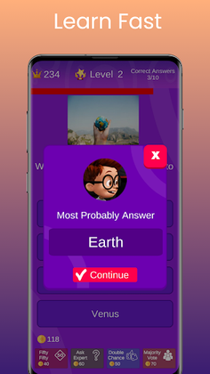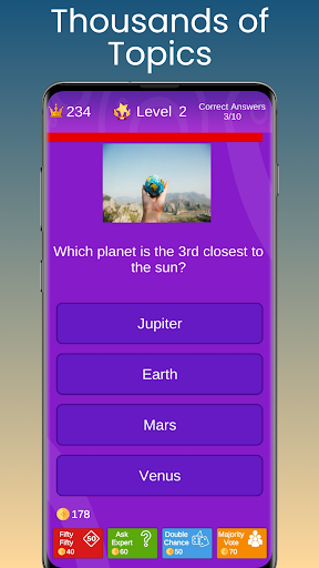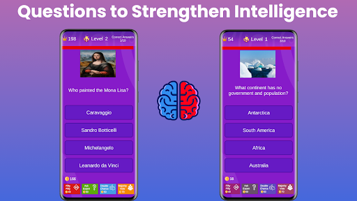 This hyper casual trivia quiz game contains several levels and each of them has new questions. You will find fifty-fifty, ask expert, double chance and majority vote options to play the game and win. Each level is full of fun questions and you will have to give the right answer to clear the level and jump to another level. After you give 10 correct answers, you can start playing the next level. So, if you are looking for fun trivia games for the family or knowledge games to play with friends, try our trivia questions and answers.