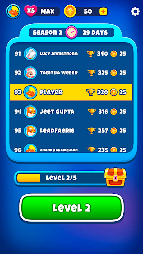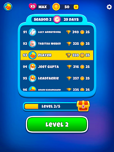 During the game, you need to earn points to move up the leaderboard. To earn more points, compete with those who are higher up on the list. Each competition consists of several questions, which are divided into categories and difficulty levels and come up randomly. In addition, you can choose from two different questions, so it's up to you - choose an easy question or challenge yourself by choosing a starred question. Remember, the harder the question, the more points you will get!