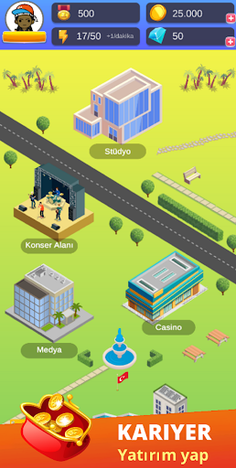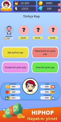 When you start the game, you create the rapper character. You can create songs that fit your style, release albums and diss other artists. You try to be the best singer of Turkey by gaining the support of the public by performing concerts in all cities of Anatolia. You can collect passive income by building buildings such as art centers, cafes, houses in your city. You have to make good choices because being a rap star is not easy!