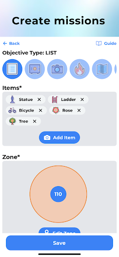 - List: The List objective includes items that the creator has set in a specific zone, players have to find and capture these items in the zone, to capture the items players need to point the camera at the item and then take a picture, players need to capture all the items in the list to complete the objective.
