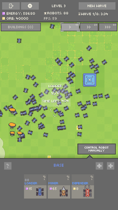 Manage a robot colony to fend off giant insects in Robot Colony 2. Explore 90 levels, control robots manually, and strategize for success with new features.