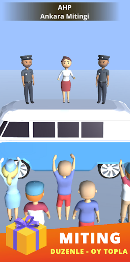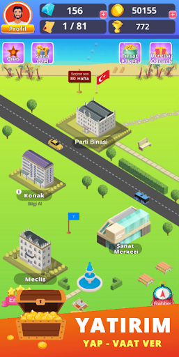 When you start the game, you create your political leader and set up your party. After determining the ideological views of the party, you organize the party's organization and you are ready for election activities. By organizing the party's rally in all cities of Anatolia, you introduce your party to the public, you get votes by making promises. You can collect passive income by building buildings such as art centers, mosques, stadiums, universities in your city. You can participate in TV shows or live broadcasts from the media building and have a dialogue with your opponents. By presenting new law proposals in the parliament, you can draw the fate of the country and fight for a better Turkey! You have to make good choices because millions of people trust you!