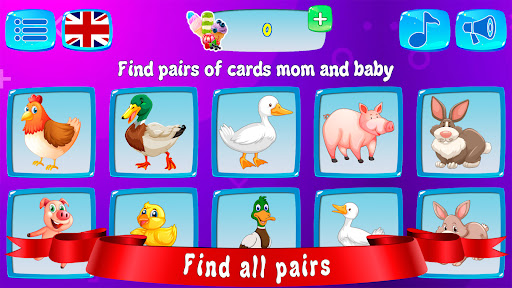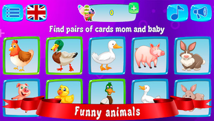 In the first mode brain games, toddler flashcards with images of different animals are presented. In the top row, the animals are mothers, and in the bottom row are their babies. Children need to carefully look at the pictures and choose the right pairs tile connect (mother and baby). It's not difficult at all! For example, if the picture shows a cow, then you need to find a calf, etc.