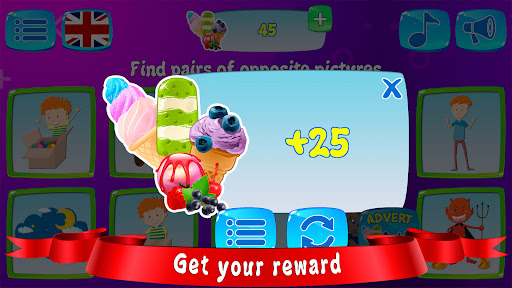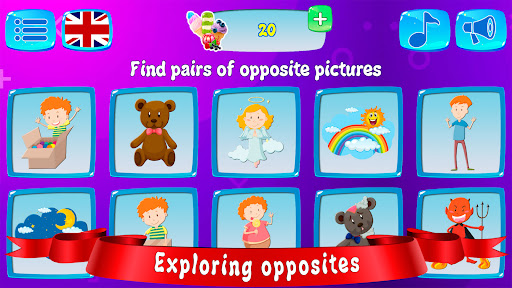 In the second game mode toddler games, you need to find pairs of pictures that seem opposite in some way. For example: day-night, clean-dirty, open-closed, etc.