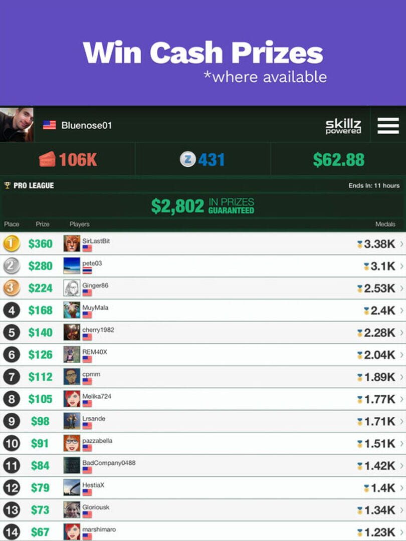 But wait, there's more! This game is no longer a solitary experience. Thanks to head-to-head competitions and large multiplayer tournaments, you can play against other players from around the world. In head-to-head games, both players solve the same deck and the player with the most points wins. With Skillz, a competition platform that includes leaderboards, trophies, physical or virtual prizes, and an amazing loyalty program that rewards you for playing, you can challenge people and win big prizes.