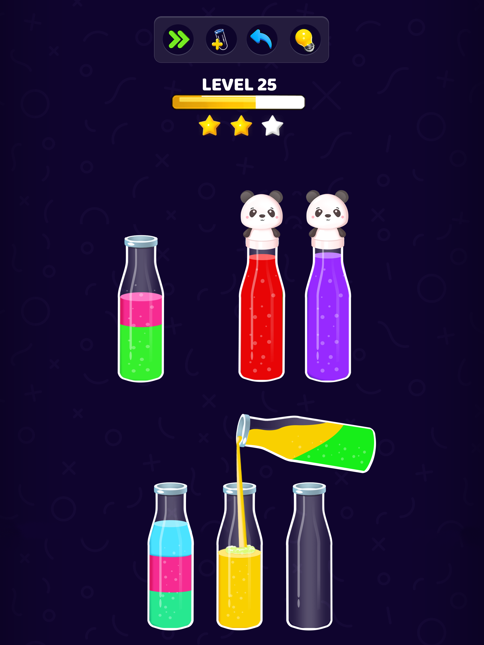 This liquid sort puzzle is a color pour game with easy and challenging bottle fill levels. Fill bottles and unlock new levels in this water sort puzzle games. Sort water in color tubes and relieve stress! Our color water pouring game is challenging and fun! If you like tap to pour games, you will love this color sort game too!
