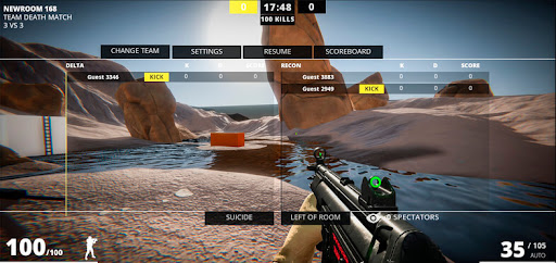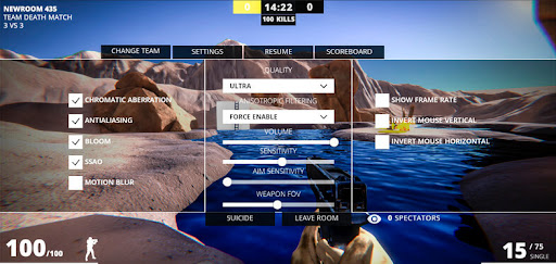 3 game modes: Team Deathmatch - Free For All - Capture of Flag.