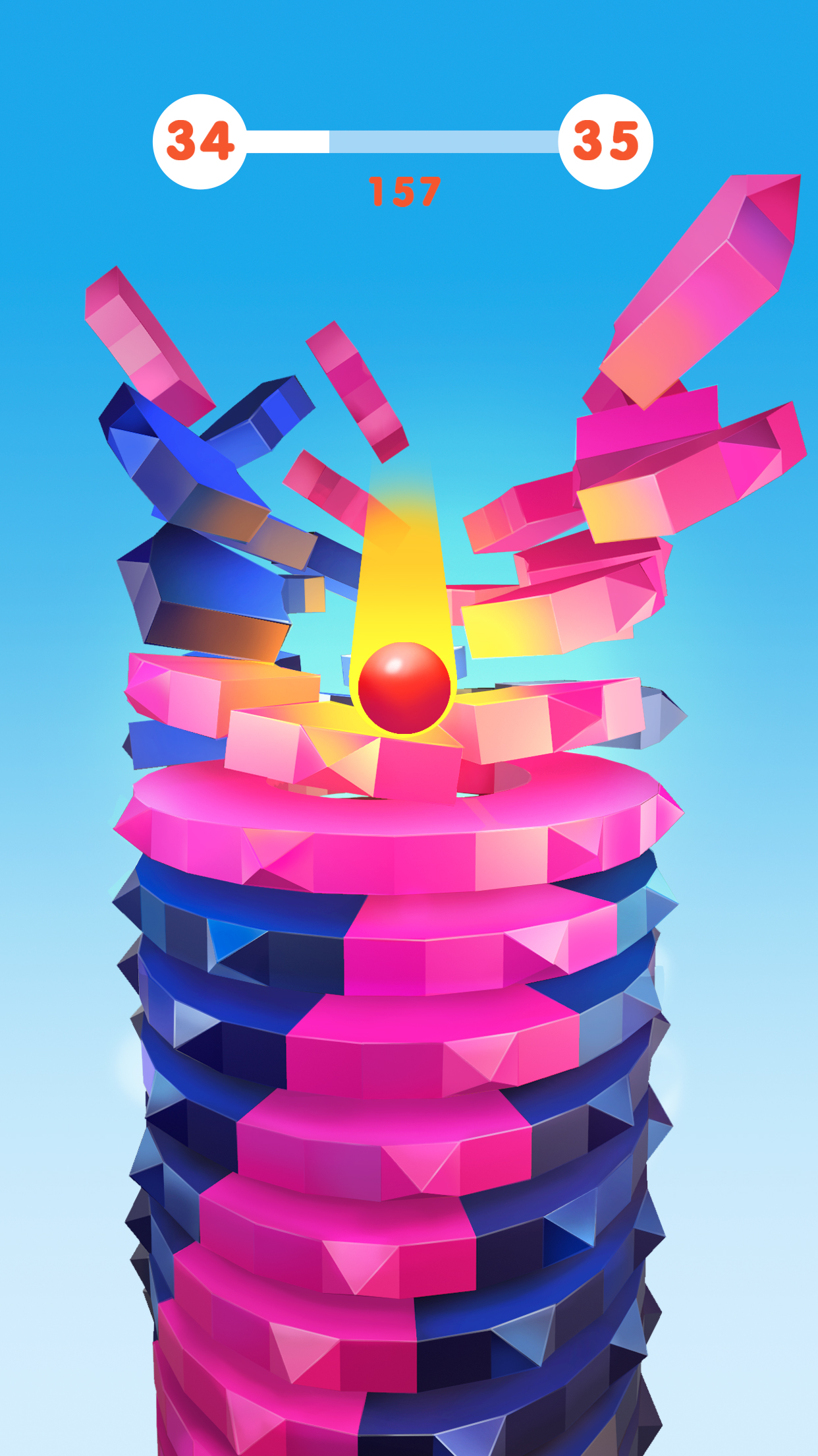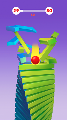 Stack Ball, from Azur Games, is a fast-paced 3D arcade game where your goal is to smash, bump, and bounce through a series of rotating helix platforms to reach the bottom. As your ball descends, it destroys the colorful platforms in its path — but beware, if you hit a black one, it's game over: your ball shatters to pieces and you must start your fall again.