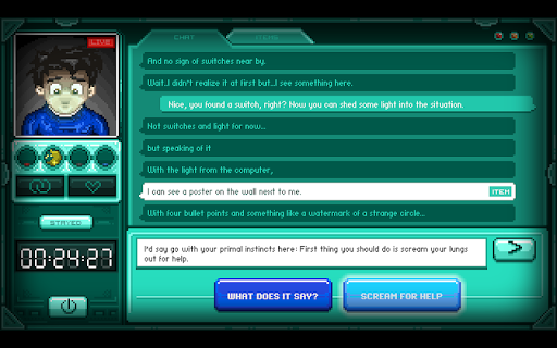 Upon awakening in isolation within a securely locked chamber, Quinn finds solace in a solitary computer linked to a virtual chat room, with you emerging as his solitary beacon of hope. Your choices - and the promptness of your responses - will singularly mold his attempts at liberation... or steer him toward an untimely demise.