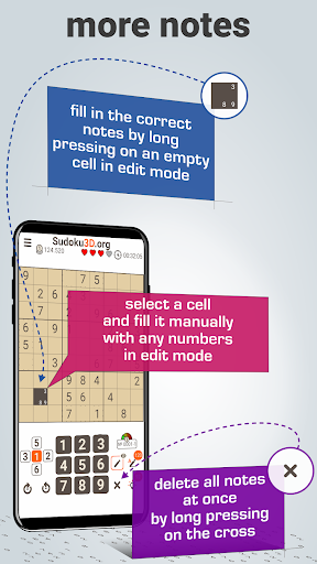 ► Select an empty cell and fill it in manually with any numbers or get the correct notes in the cell by long pressing on an empty cell in edit mode.