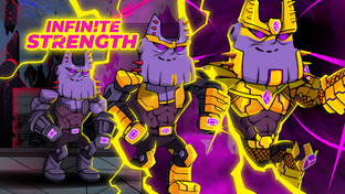 The Mad Titan is powered by the gems of space and stone, giving him the ability to open portals and manipulate rocks. The Mad Titan's spaceship was acquired from aliens drifted into space near Hero World. War Monster is a direct descendant of the War God and Orc Chieftain, giving him ancient power and brute strength. War Monster's army follows him to war anywhere, inspired by his warcries.