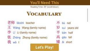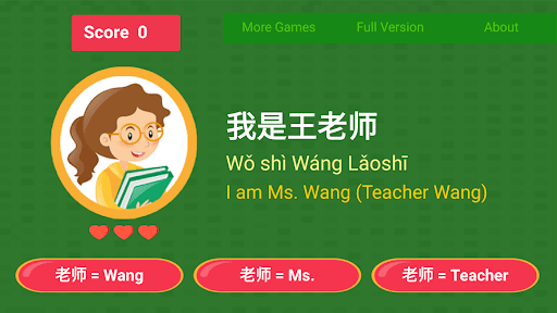 This game is NOT a casual game. It is intended for Chinese learners who already have some basic knowledge of Chinese, understand how to read pinyin, and are typically already engaged in a Chinese learning program. We highly recommend you to carefully read the lesson and memorize the vocabulary words before playing the game in order to fully enjoy the mini-game, especially its full version.