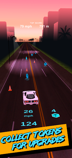 In Turbo 84, your reflexes and sound driving skills will come in handy as you dodge multiple obstacles such as other cars, barriers, and traffic cones. But you don't have to rely solely on your abilities as collecting tokens, tickets, and power-ups throughout the journey can aid you. These power-ups include magnets and speed boosts that help you to collect more tokens easily. The game features the option of customizing your car's color and style to make Turbo 84 your unique experience.