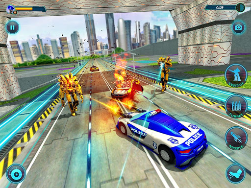Drive cops car to destroy evil mech warrior by hitting them with modern weapons. As super robot warrior fighter, survive in the conditions of war with the fast police car to eliminate gangster robots.