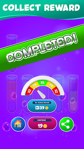 The game gets more challenging as you progress, with more tubes, containers, and colors to sort.