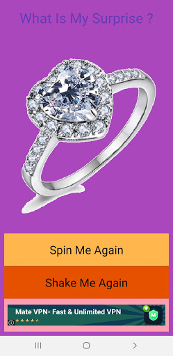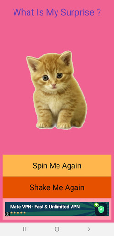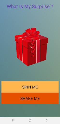 "What Is My Surprise" is very easy to use. Click the options, Spin or Shake and a cool animation will start and then a Surprise will pop up, each press on the options button will generate a different surprise.
