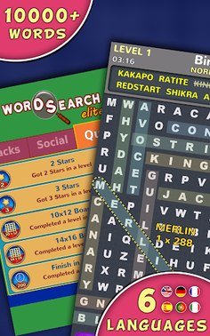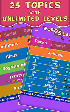 Word search game with 10k+ words in 25 topics, 5 board sizes, and 4 difficulty levels. Social features, achievements and word meanings.