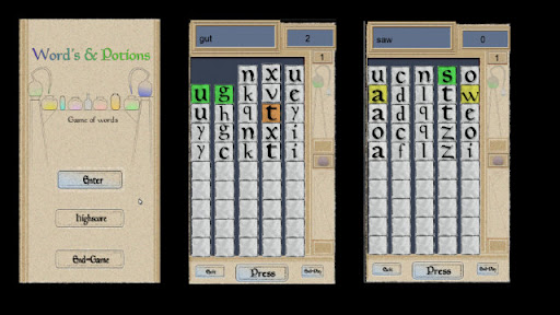 blocks that have letters inscribed in them drop. You Tap the block with the letter to activate block to until you create your word. every word created you get points the bigger the word the more points you get. with the right amount of words you create potions bottles. Each potion bottle have special mixes that can help You.