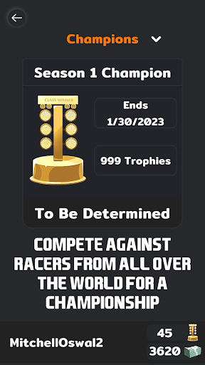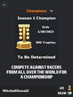 - Have the most trophies out of any racer at the end of the season? Your username will be permanently added into the game as a Champion in the "Champions" menu!