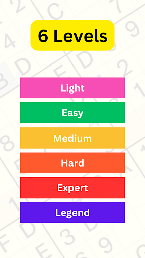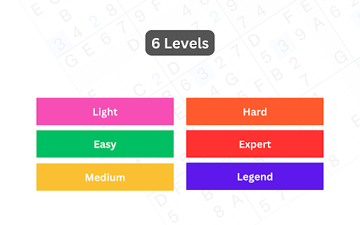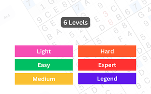 ✓ 6 Difficulty levels - Light, Easy, Medium, Hard, Expert (for perfect Sudoku players), and Legend (for advanced players).