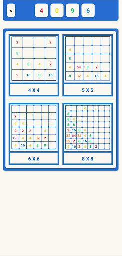 Normal: You can choose any playing field 4x4, 5x5, 6x6, 8x8. It is necessary to move and connect the numbers to get a tile with a face value of "4096" (if you wish, you can continue further).