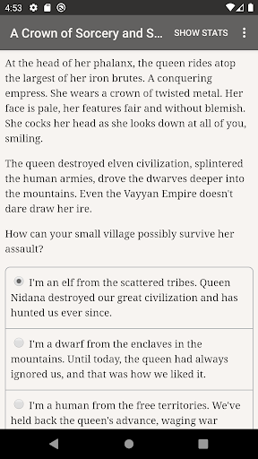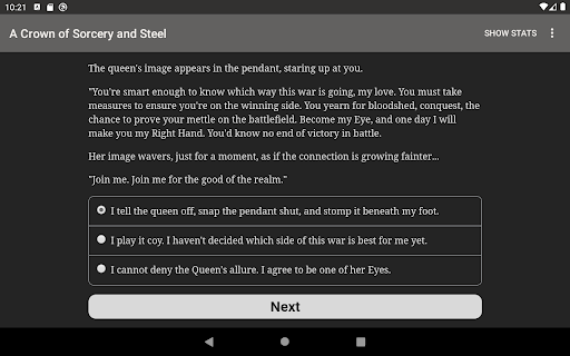 It is up to you to decide the outcome of this immersive interactive fantasy. Will you become a great leader and unite the realm to overthrow the queen, or will you support her and establish your dominion by her side? Enter the fantastical world of 'A Crown of Sorcery and Steel' and leave your mark on history.