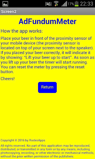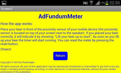 Please note that Ad Fundum Meter is the exclusive property of RodeoApps. Any unauthorized reproduction, distribution, or transmission of this app is strictly prohibited. Don't risk it, and enjoy the app responsibly. Cheers!