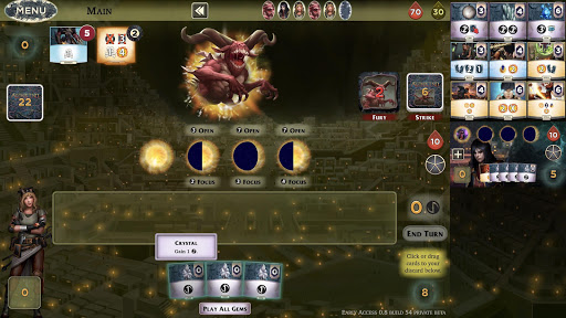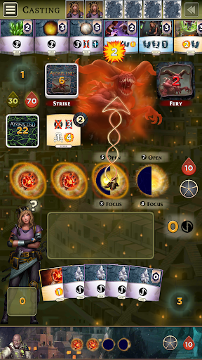 You build your deck with player cards from the market. 3 gems, 2 relics, and 4 spells allow you to grow your powers to hold back the nemesis. The market is constructed from 27 unique gems, relics, and spells. Either take a randomly generated market, or build the perfect one yourself during setup.