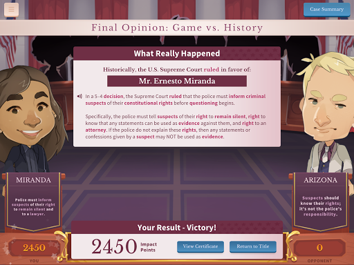 Win Supreme Court cases by using persuasive abilities. Compete against other lawyers in Argument Wars, featuring real cases. English language learners can access assistance.
