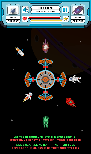 Astrolien is a Space Game that falls under the hyper-casual game category. It is an amazing space game that all ages can enjoy, simple but hardest to score high in this space game. There is a space station as a saving point and some aliens will chase the astronauts so they come faster toward the space station, you should turn the station as a commander of the space station to allow astronauts inside the space station. It is a hyper-casual space game, simply rotate the space station to let the astronauts inside and at the same time block (or) destroy the aliens.
