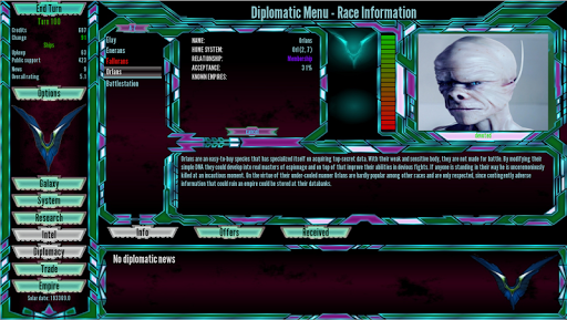 Embark on a thrilling journey through space with Birth of the Empires, a turn-based 4X strategy game reminiscent of classic titles such as Microprose's Master of Orion 2 and ST: Birth of the Federation! The game takes place in a vast galaxy filled with fascinating worlds, lifeforms, and anomalies, and players must choose one of six major races to control and establish superiority over a section of the universe through military or diplomatic means. Multiple victory conditions are available at the start of the game, making each playthrough a unique experience.