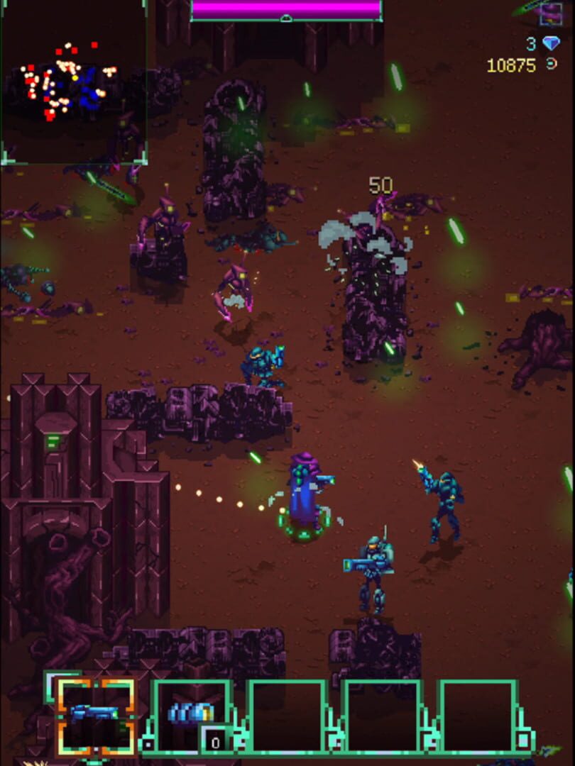 Blast Waves: a tactical arcade shooter with rogue-like Survival Mode and auto battler-like Command Mode. 100s of weapons and unique biomes.