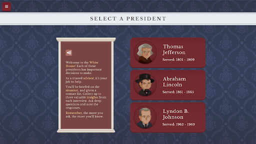 Take on the job of advising the president through historical challenges by talking to people in and around the White House. Consult with confidants within the White House and use evidence-based reasoning to provide the president with counsel.