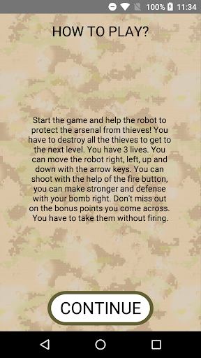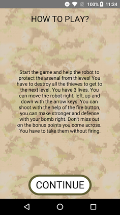 You have to destroy all the alien soldiers to move on to the next level. You have 3 lives. You can move the robot right, left, up and down with the arrow keys. You can shoot with the help of the fire button, you can make a stronger defense with your bomb right. Don't miss out on the bonus points you come across. You have to take them without firing.