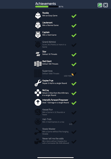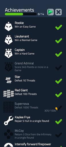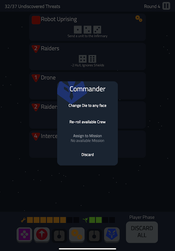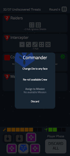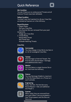 You are the captain of a spaceship deep inside enemy territory, and you need to make the best use of your crew to make it out. You will be rolling dice, which represent your crew, and assigning them to different stations to deal with incoming external and internal threats. Will you use your science die to recharge shields or fix that time warp? Will you send your engineers to deal with a robot uprising or repair your hull? Will you lead your crew to victory or meet your doom in the cold void of space?